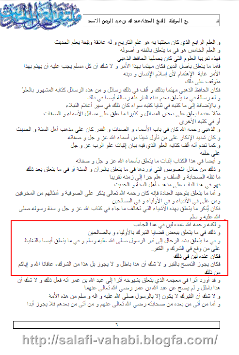 نویسنده، شیخ ومحدث وهابی(عبد الله بن عبد الرحمن السعد) استاد دانشگاه ملک سعود، در کتابش (شرح المو قظه) در معرفی( امام ذهبی) می گوید: امام ذهبی در بسیاری موارد در مورد اعمال شرک امیز مثل تبرک به اولیاء وصالحین و بار سفر بستن برای زیارت قبوررسول خدا (صلی الله علیه وسلم) و اموری که منجر به شرک وکفر میشود سهل انگار بوده چرا که دست کشیدن به قبوررا جایز میدانسته است وهمه میدانند که این عمل جایز نیست وباطل است «وفيما يتعلق أيضاً بالتغليظ على من وقع في الشرك والكفر فكان عنده -أي الذهبي - لين في ذلك كان يجوّز التمسح بالقبر ولا شك أن هذا باطل ولا يجوز بل هذا من الشرك عافانا الله وإياكم من ذلك».