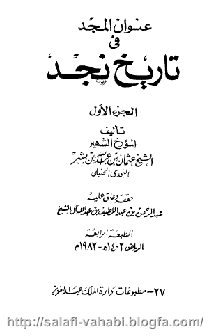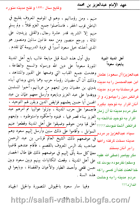 نویسنده وهابی ابن بشر در کتابش (عنوان المجد) در وقایع سال 1220 می گوید: