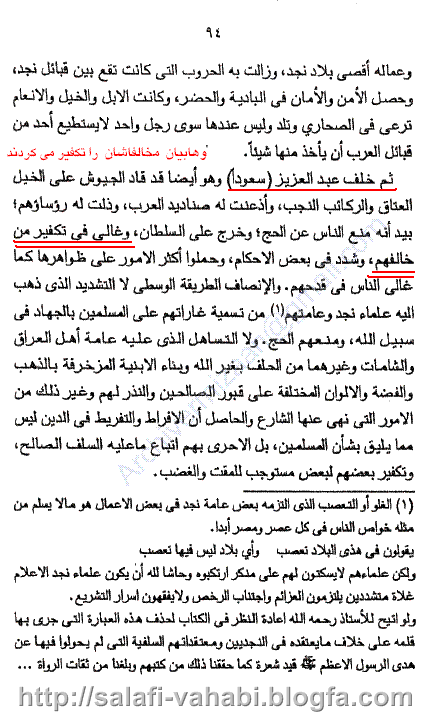 تاریخ نویس معروف وهابی (آلوسی) در کتاب معروفش که مورد تایید وهابیون و آل سعود هم هست در صفحه 94 می گوید : پس از جانشینی (عبد العزیز) : او وپیروانش هر کس که با عقائدشان مخالف بود به سختی تکفیر میکردند