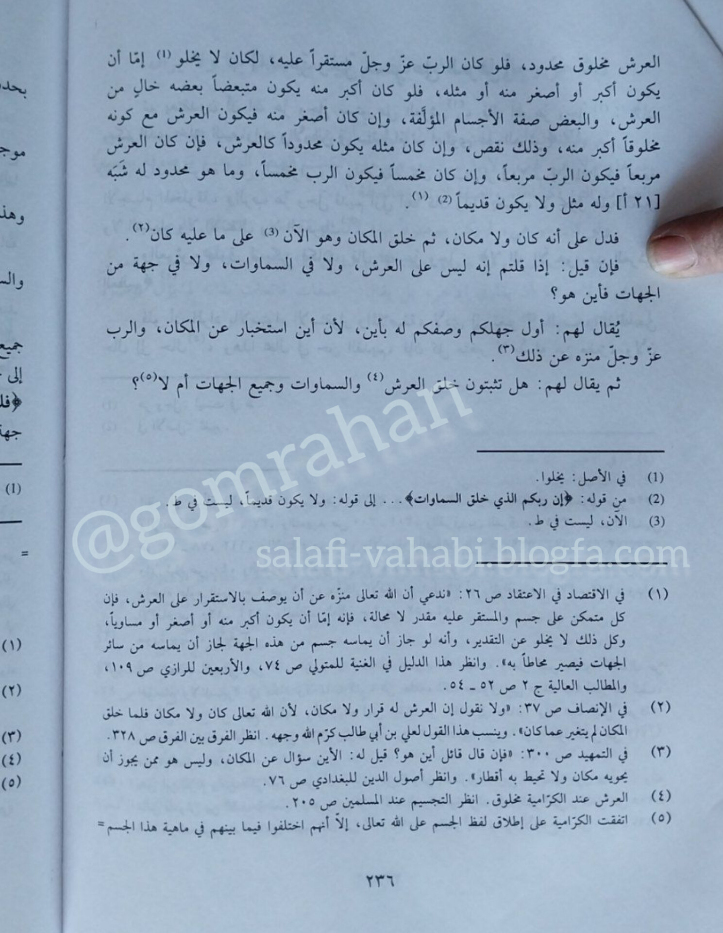 ✔️اولین جهالت وهابیان سلفی که برای الله تعالی مکان قائل هستند 🔹امام ابواسحاق شیرازی شافعی مذهب (متوفی ٤٧٦ هـ) در الإشارة إلى مذهب أهل الحق میگوید: 🔹فإن قيل: إذا قلتم إنه ليس على العرش ولا في السماوات ولا في جهة من الجهات فأين هو؟ يقال لهم: أول جهلكم وصفكم له بأين، لأن أين استخبار عن المكان والرب عز وجل منزه عن ذلك. 🔸اگر به شما بگویند: شما که میگویید، او نه بر روی عرش است ، نه در آسمانها است و نه در جهتی از جهات است ، پس کجا است؟ 📚الإشارة إلى مذهب أهل الحق ص۲۳۶ ♨️مجموعه گروههای نَقدِ مُستَنَدِ وهابیت 📱 تلگرام : گمراهان را بشناسیم https://telegram.me/gomrahan 📱 ایتا : نَقْدِ مُسْتَنَدِ گمراهان https://eitaa.com/gomrahan 🖥وبلاگ: سلفی و وهابی http://salafi-vahabi.blogfa.com