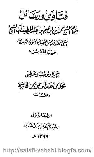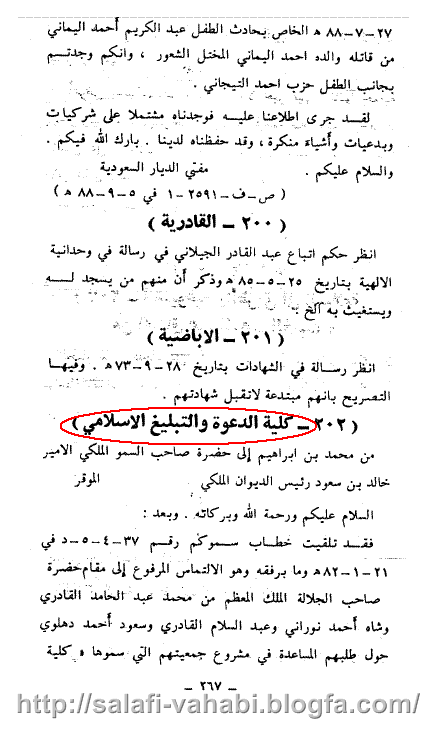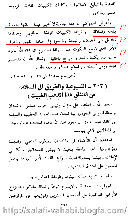 محمد بن ابراهیم آل شیخ (مفتی وهابی سلفی) طی نامه ای به (ملک خالد بن عبد العزیز آل سعود) او را از جماعت تبلیغ پرهیز داده و آنان را گروهی پیرو بدعت وگمراهی ودعوتگر به عبادت قبور وشرکیات معرفی میکند !!!!!