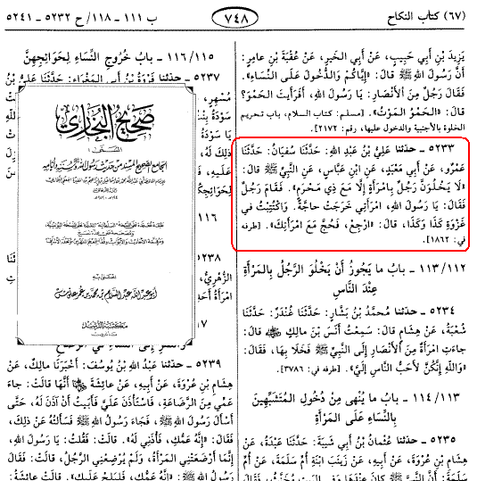 و این در حالی است که رسول خدا (صلی الله علیه وسلم) شوهر را از رفتن به جهاد منع کرده اند و سفر حج را برای زن بدون همراهی با محرم مجاز منع کرده اند امام بخاری در کتاب (صحیح) روایتی را نقل میکنند که : حدثنا علي بن عبد الله حدثنا سفيان حدثنا عمرو عن أبي معبد عن ابن عباس عن النبي صلى الله عليه و سلم قال : ( لا يخلون رجل بامرأة إلا مع ذي محرم ) . فقام رجل فقال يا رسول الله امرأتي خرجت حاجة واكتتبت في غزوة كذا كذا قال ( ارجع فحج مع امرأتك ) ترجمه : پیامبر (صلی الله علیه وسلم) فرمودند :مرد با زن در جای خلوت نباشد مگر اینکه محرمی برای آنها باشد)مردی به پا خواسته گفت: یا رسول الله همسرم عازم حج است و من همبه همراه شما عازم جهاد در فلانجا هستم . پیامبر فرمودند :برگرد وهمراه همسرت به حج برو