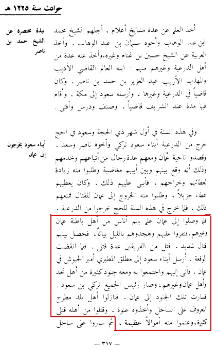 مورخ مشهور سعودی نجدی حنبلی (عثمان بن عبدالله ابن بشر) در کتابش (عنوان المجد فی تاریخ النجد ج1 صفحه 317 ) در وقایع سال 1225 هجری می نویسد: فلما وصلو علی عمان علم بهم الناس من اهل باطنة عمان و غیرهم . ففرو علیهم وهجدوهم باللیل بیاتاً، فحصل بینهم قتال شدید. قتل من الفریقین عدةقتلی. فلما انقضت الواقعة، أرسل ابناء السعود الی مطلق المطیری أمیر الجیوش فی عمان، فأتی الیهم اجمعوا به و معه جنود کثیرة من اهل نجد واهل عمان وغیرهم وصار رئیس الجمیع ترکی بن سعود .فسارت تلك الجنود إلى عمان فنازلوا أهل بلد مطرح المعروف على الساحل وأخذوه عنوة، وقتلوا من أهله قتلى كثيرة، وغنموا منه أموالا عظيمة ترجمه : وقتی به عمان رسیدند مردم عمان واطراف آگاه شده فرار کردند .و شب را در بیابانها بیتوته کرده وبین آنها جنگ شدیدی صورت گرفت که از دو طرف افراد زیادی کشته شدند. پس از این واقعه فرزندان سعود به سوی (مطلق المطیری) که فرمانده جنگجویان منطقه عمان بود پیکی را فرستادند، او هم با سپاهش که شامل جنگجویان منطقه نجد و عمان وجاهای دیگر بودند به آنان پیوست . فرمانده تمام آنها در آن جنگ (ترکی بن سعود) بود .این سپاه به سوی عمان رفت و بر مردم شهر معروف(مطرح) را که در ساحل بود هجوم برده ، آنان را گرفته بسیاری از آنها را کشتند و اموال بسیاری را به غنیمت گرفتند. ![]() ![]() لینکهای مرتبط : وهابیان و کشتار اهل سنت(مردم طائف) قتل عام مردم طائف توسط وهابیان محاصره وفتح مدینه وآموزش فرائض واقرار توحید دادن به آنها توسط وهابیان غارت حرم نبوی توسط وهابیان (سلفی) قتل عام مردم طائف توسط وهابیان از زبان علامه جمیل صدقی الزهاوی کشتار کربلا و تخريب و غارت حرم حسين بن علي رضي الله عنه توسط وهابیان