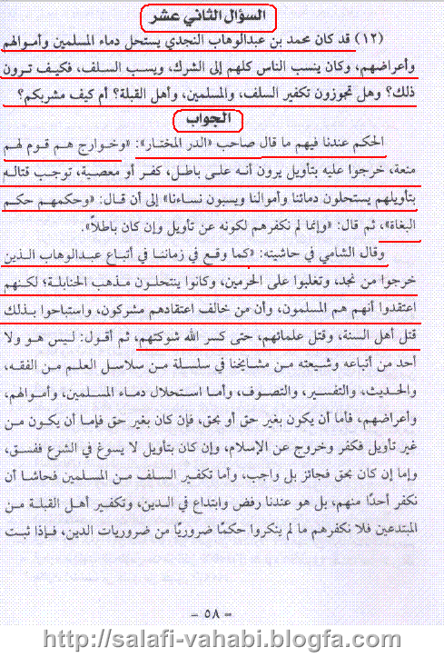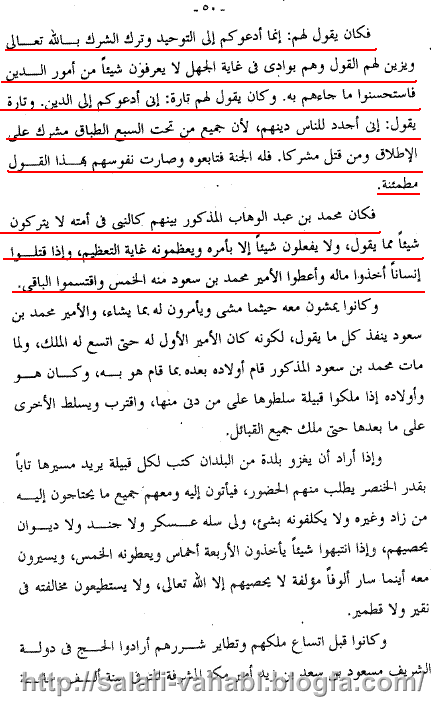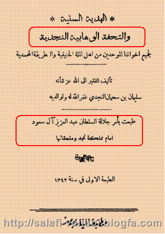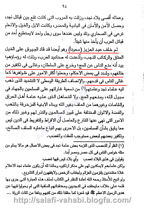 تاریخ نویس معروف وهابی (آلوسی) در کتاب معروفش که مورد تایید وهابیون و آل سعود هم هست در صفحه 94 می گوید : پس از جانشینی (عبد العزیز) : او وپیروانش هر کس که با عقائدشان مخالف بود به سختی تکفیر میکردند