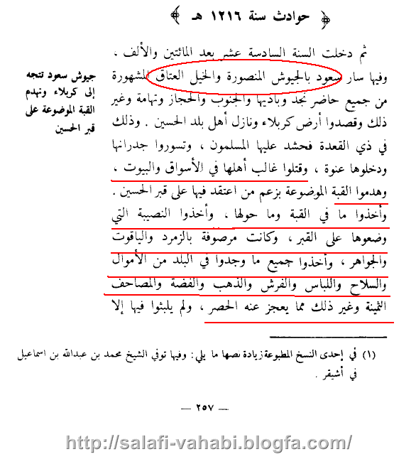 شيخ عثمان نجدي از مورّخان وهّابي مي نويسد: «وهابيان به صورت غافلگيرانه وارد كربلا شدند و بسياري از اهالي آنجا را در كوچه و بازار كشتند. ضريع حسين (رضی الله عنه) را خراب كردند و آنچه داخل آن بود را غارت نمودند و در شهر نيز هر چه از اموال، اسلحه، لباس، طلا و فرش و قرآن نفيس يافتند را ربودند، نزديك ظهر از شهر خارج شدند، در حالي كه قريب به دو هزار تن از اهالي كربلا را كشته بودند». )عنوان المجد في تاريخ نجد، ج 1، ص 257 - 258، حوادث سال 1216. )