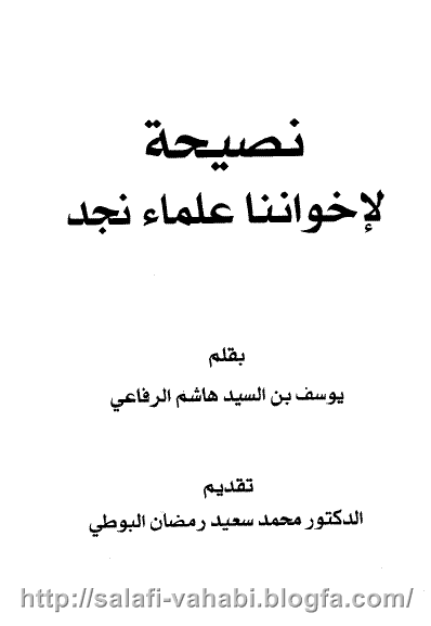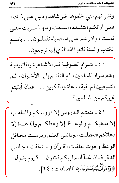 شیخ (یوسف بن سید هاشم رفاعی) در کتابشان(نصیحة لاخواننا علماء نجد) ضمن نصیحت به وهابیان حجاز، درباه تکفیرعموم مسلمین ومنع تدریس علوم دیگر مذاهب اسلامی وممانعت از برپایی مجالس وعظ ودعوت و مجالس قران توسط وهابیان می گویند: 40. شما صوفیه و سپس اشاعره و ماتریدیه را که شامل بیشتر مسلمین هستند، راکافر شمرديد و بعد از آنها اخوان المسلمین و سپس تبلیغیین و باقی دعوتکنندگان و مفکرین و ... را کافر دانستيد. آیا مسلمانی را غیر از خودتان باقی گذاشتید؟ 41. همه دروس را منع کردید، مگر دروس خودتان را، و همه مذاهب را منع کردید، مگر مذهب خودتان را، و همه موعظهها و دعوتکنندگان را به جز موعظهها و دعوتکنندگان خودتان را منع کردید و سبب شدید که مجالس علم، تعطیل و محافل موعظه نابود شود. حلقههای قرآنی خالی و مجالس ذکر تحقیر شد. فردای قیامت در مقابل پروردگارتان چه خواهید گفت؟ همان روزی که گفته میشود: «وَ قِفُوهُمْ إِنَّهُمْ مَسْؤُلُون»