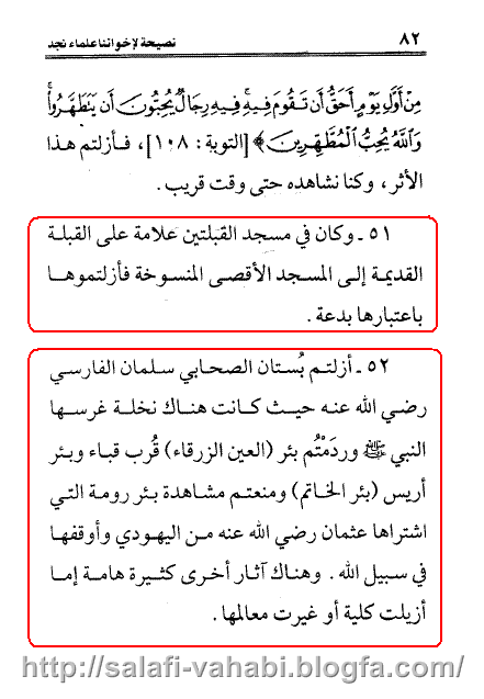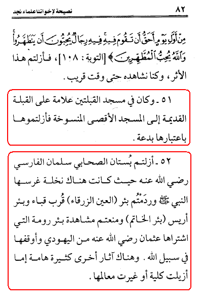 داشت که آن را به اعتبار اینکه بدعت است، نابود کردید. 52. باغ صحابی بزرگ سلمان فارسی را فقط به این بهانه که در آنجا درخت خرمایی بود که پیامبر آن را کاشته بود، نابود کردید. چاه زرقا (العین الزرقاء) در نزدیکی قبا و چاه اریش (بئر خاتم) را از بین بردید. از زیارت چاه رومه که عثمان آن را از یهودیای خریده و در راه خدا وقف کرده بود، منع کردید. و آثار بسیار و مهمِ دیگری وجود دارد که یا به طور کلی نابود شدند و آثار و نشانههایشان تغییر کرده است.