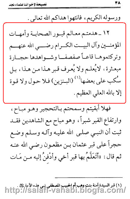 شیخ (یوسف بن سید هاشم رفاعی) در کتابشان(نصیحة لاخواننا علماء نجد) ضمن نصیحت به وهابیان حجاز،گوشه ای جنایات انها را هویداکرده جسارت وتوهین آنها را به صحابه وامهات مومنین واهل بیت پیامبر (صلی الله علیه وسلم) را گوشزد کرده می گویند : 12 - هدمتم معالم قبور الصحابة وأمّهات المؤمنين وآل البيت الكرام رضي اللّه عنهم وتركتموها قاعاً صفصفاً وشواهداً حجارة مبعثرة لا يُعلم ولا يُعرف قبر هذا من هذا بل سُكب على بعضها(1) البنزين فلا حول و لاقوّة إلاّ باللّه. (1) قبر السيدّة آمنة بنت وهب أم الحبيب المصطفى نبيّ هذه لأمّة(صلى الله عليه وسلم) ترجمه : 12.شما آثار قبور صحابه و مادران مومنین و آل البیت کرام را نابود و آن را بصورت پست و هموار رها کردید. گواه آن سنگهای پراکندهای است که این قبر از آن قبر شناخته نمیشود، حتی بر روی بعضی از آنها[قبر حضرت آمنه دختر وهب مادر پیامبر اکرم صلی الله علیه وسلم رسول این امت.] بنزین ریخته شده است. فلا حول ولا قوه الا بالله العلی العظیم.