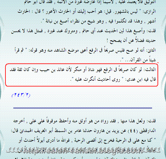 این در حالی است که اصل سخن ابن عدی در کتابش (الکامل فی الضعفاء جلد7 صفحه63) اینگونه است : وعائذ بن حبيب روى عنه أهل الكوفة وعائذ روى هو عن هشام بن عروة أحاديث أنكرت عليه وسائر أحاديثه مستقيمة ترجمه: وعائذ ابن حبیب که اهل کوفه از او حدیث نقل می کننداو از هشام ابن عروة احادیث منکر را نقل میکند ولی بقیه احادیثش راست ودرست است ![]() :::::::::::::::::::::::::::::::::::::::::::::::::::::::::::::::::::::::::::::::::::::::::::::::::::::::::: او با خیانت، بخش دوم سخن ابن عدی را که میگوید (وسائر أحاديثه مستقيمة) را حذف کرده وبر خواننده اینگونه القاء میکند که ابن عدی گفته است تمام احادیث عائذ بن حبیب مورد انکار است