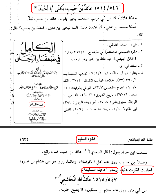 البانی(وهابی سلفی)با خیانت علمی آنگاه که می خواهد (عائذ ابن حبیب) را معرفی کند سخنی را به ابن عدی نسبت داده است و معنای سخن او را وارونه جلوه داده میگوید : عائذ بن حبيب وإن كان ثقة فقد قال فيه ابن عدي : ( روى أحاديث أنكرت عليه ) ترجمه: عائذ ابن حبیب هر چند که ثقه است اما ابن عدی درباره اش گفته است (او احادیث منکر را روایت میکند)