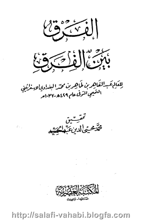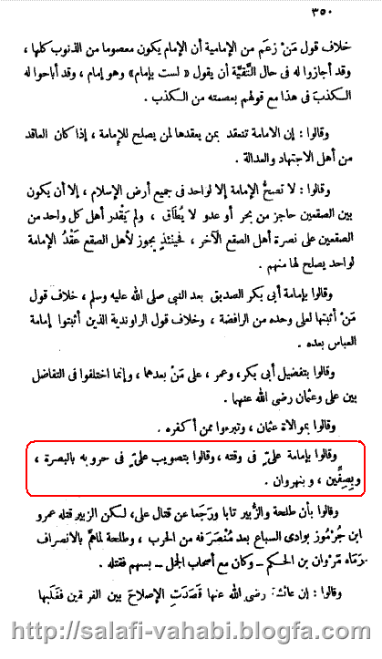 همچنین امام ابو منصور بغدادی در کتابشان (الفرق بین الفرق) در بیان اصولی که همه اهل سنت بر آن اتفاق نظر دارند می گوید : وقالوا بامامة على في وقته وقالوا بتصويب على في حروبه بالبصرة وبصفين وبنهروان ترجمه : همگی گفته اند که علی در زمان خود امام بوده وگفته اند که در تمامی جنگهایش بر حق بوده ، چه در جنگ بصره وچه در جنگ صفین وچه در جنگ نهروان