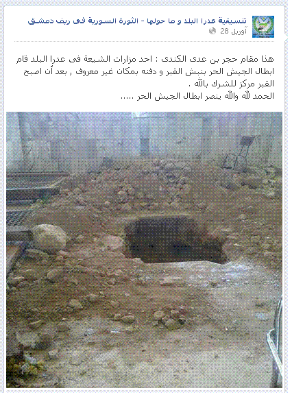 هتک حرمت و نبش قبر صحابی جلیل القدر پیامبر حجر بن عدی به بهانه جلوگیری از شرک!!!!!!! یگان موسوم به "هماهنگي منطقه عدرا البلد در حومه دمشق" وابسته به ارتش آزاد سوریه، با انتشار اين خبر در صفحه فيسبوک خود و انتشار تصاوير اين هتک حرمت بی سابقه، اعلام کرد: «اين بارگاه "حجر بن عدی الکندی" یکی از قبور معروف نزد شيعيان در "عدرا البلد" (در حومه دمشق) است که قهرمانان ارتش آزاد سوريه، آن را نبش کرده و جنازه را به مکان ناشناخته دیگری منتقل کرده و دوباره دفن کردند تا ديگر اين مکان، مرکزي براي شرک ورزیدن به خدا نشود.» ![]() برچسبها: اهل سنت در مقابل وهابیت, اعتقادات وهابيت, جنایات وهابیت, توهین وهابیت به بزرگان اهل سنت [ پنجشنبه دوازدهم اردیبهشت ۱۳۹۲ ] [ 17:30 ] [ عبد الحمید ]